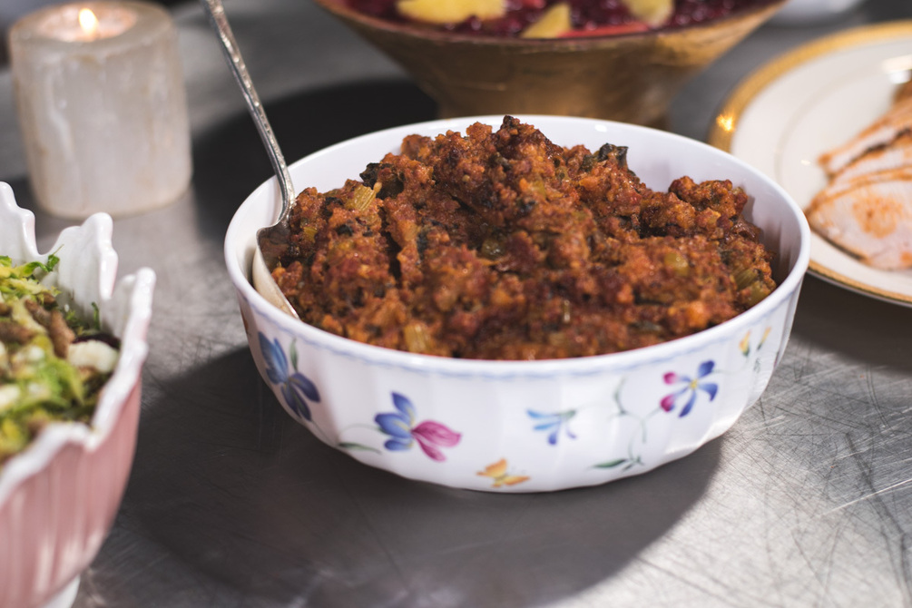 Roast Turkey Adobado with Smoked Poblano, and Portobello, Chorizo Stuffing Turkey stuffed under the skin with maple, chili-lime paste, stuffed with cornbread, smoked poblano chilies, portobello mushrooms